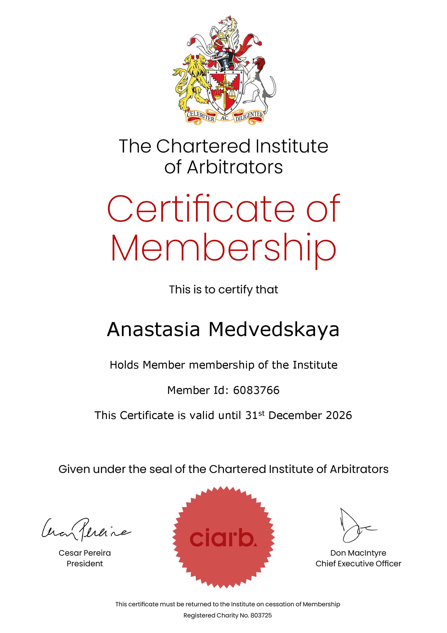 Anastasia Medvedskaya has obtained Member status (MCIArb) with the Chartered Institute of Arbitrators (CIArb).